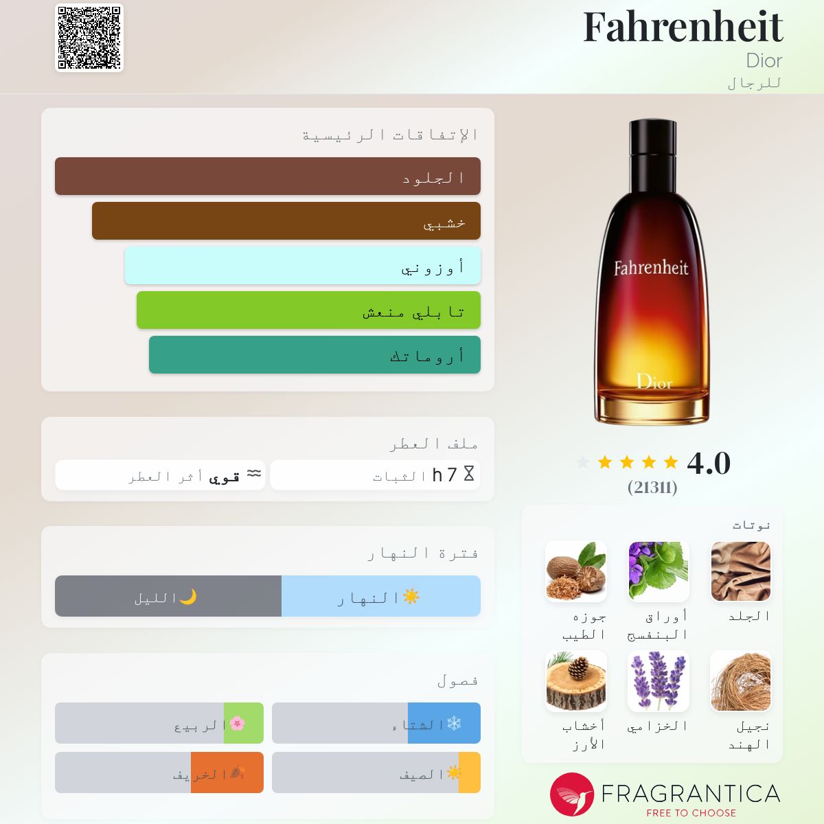 Fahrenheit Dior عطر أروماتك - فوچير للرجال . Fahrenheit صدر عام 1988. Fahrenheit من توقيع Jean-Louis Sieuzac, Michel Almairac و Maurice Roger. إفتتاحية العطر زهر جوزه الطيب, الخزامي, خشب الأرز, الماندرين (اليوسفي), الكاموميل, البرغموت, الزعرور البري و الليمون; قلب العطر أوراق البنفسج, جوزه الطيب, خشب الأرز, خشب الصندل, زهر القرنفل, زهر العسل - صريمة الجدي, الياسمين و زنابق الوادي; قاعدة العطر تتكون من الجلود, نجيل الهند, المسك, العنبر, الباتشولي و حبوب التونكا.