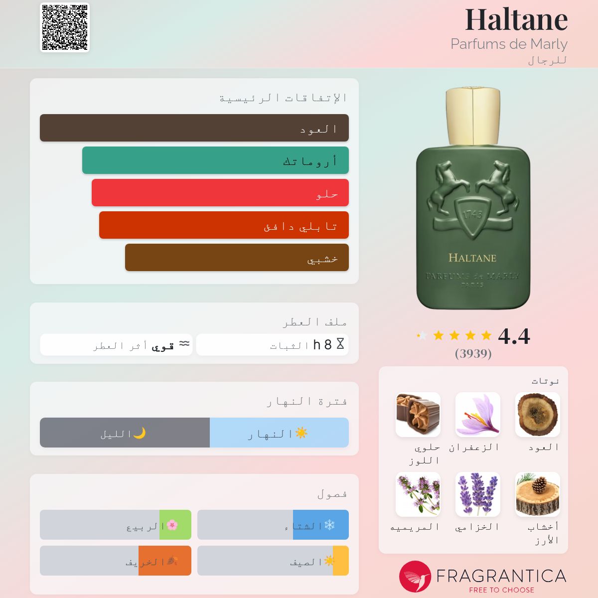 عطر خشبي - أروماتك للرجال . Haltane صدر عام 2021. إفتتاحية العطر الخزامي, المريمية و البرغموت; قلب العطر الزعفران و حلوي اللوز; قاعدة العطر تتكون من العود و خشب الأرز.
