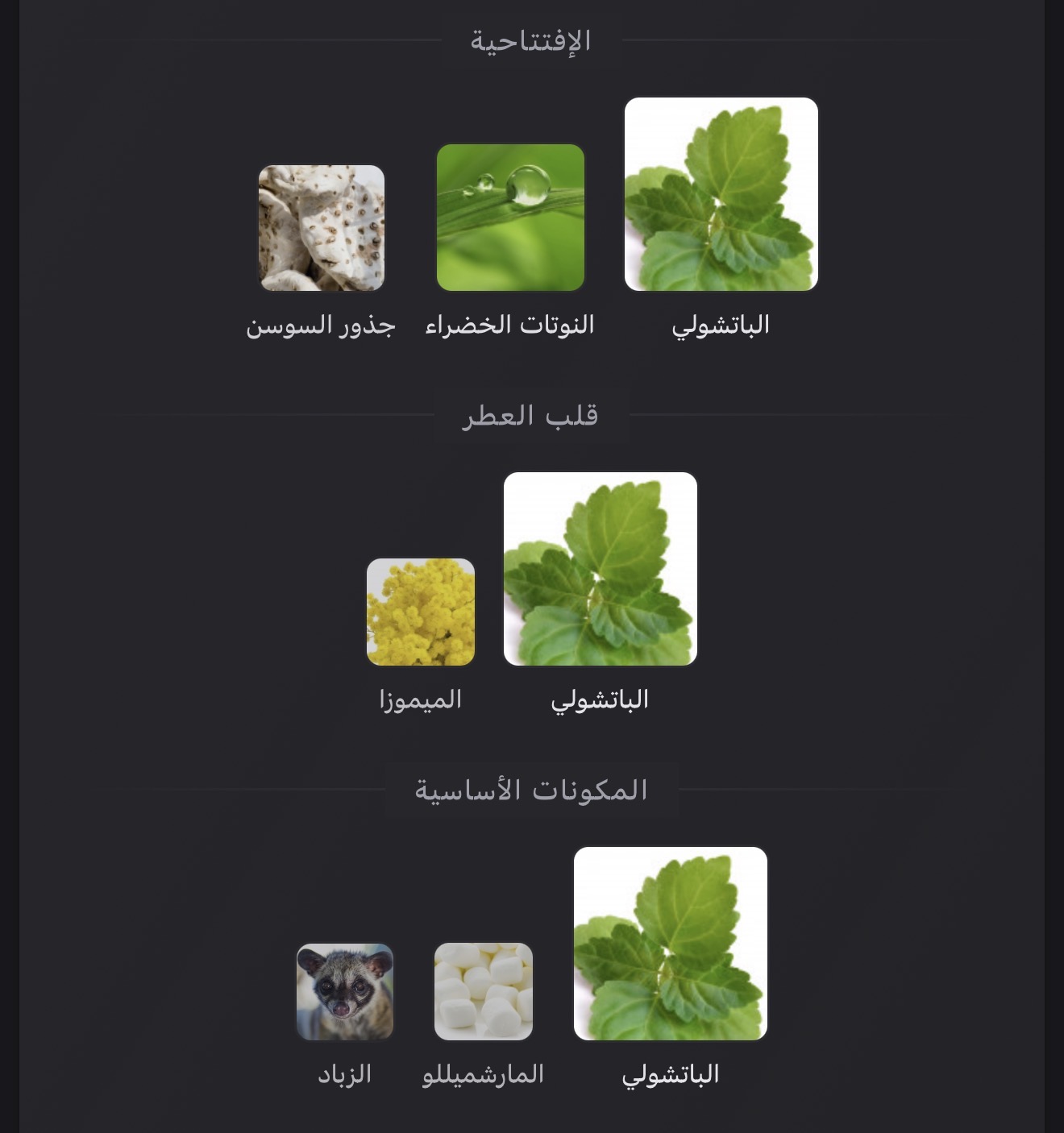 عطر للجنسين. Sole Patchouli صدر عام 2017. إفتتاحية العطر الباتشولي, النوتات الخضراء و جذور السوسن; قلب العطر الباتشولي و الميموزا; قاعدة العطر تتكون من الباتشولي, المارشميللو و الزباد.