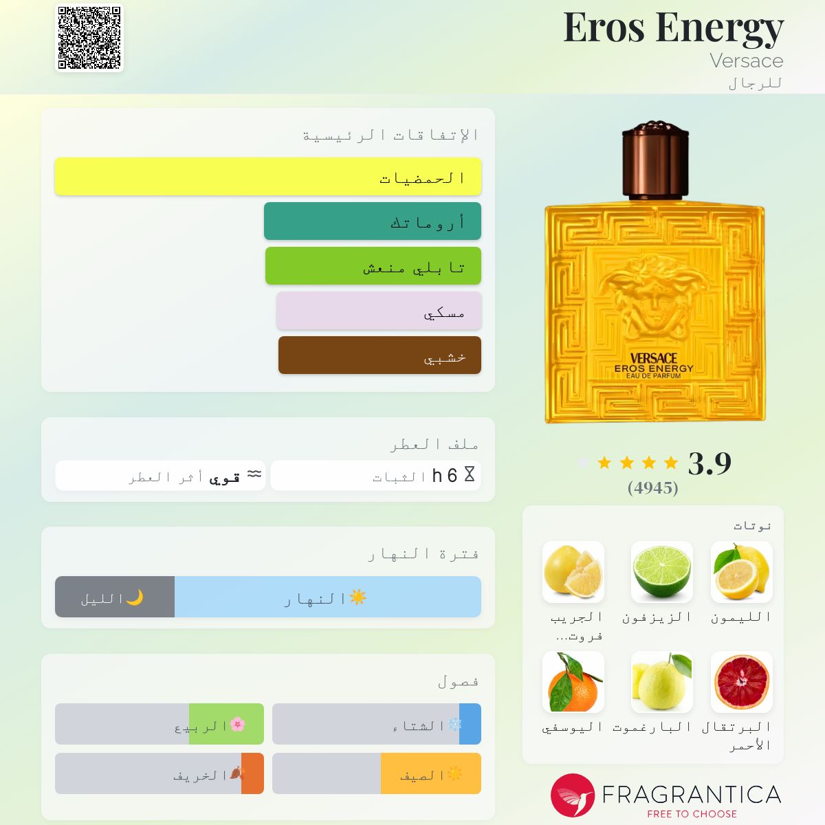 عطر حمضيات - أروماتك للرجال . Eros Energy صدر عام 2024. إفتتاحية العطر الليمون, الليم, الجريب فروت, البرتقال الأحمر, البرغموت الصقلي و الماندرين (اليوسفي); قلب العطر الفلفل الوردي, العنبر الأبيض و الكشمش الأسود; قاعدة العطر تتكون من المسك, طحلب البلوط (طحلب السنديان) و الباتشولي.