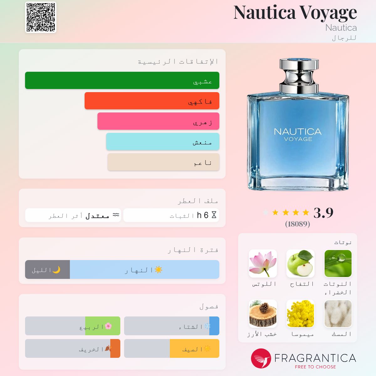 عطر خشبي - مائي للرجال . Nautica Voyage صدر عام 2006. Maurice Roucel قام بتوقيع هذا العطر. إفتتاحية العطر الأوراق الخضراء و التفاح; قلب العطر اللوتس و الميموزا; قاعدة العطر تتكون من المسك, خشب الأرز, طحلب البلوط (طحلب السنديان) و العنبر.