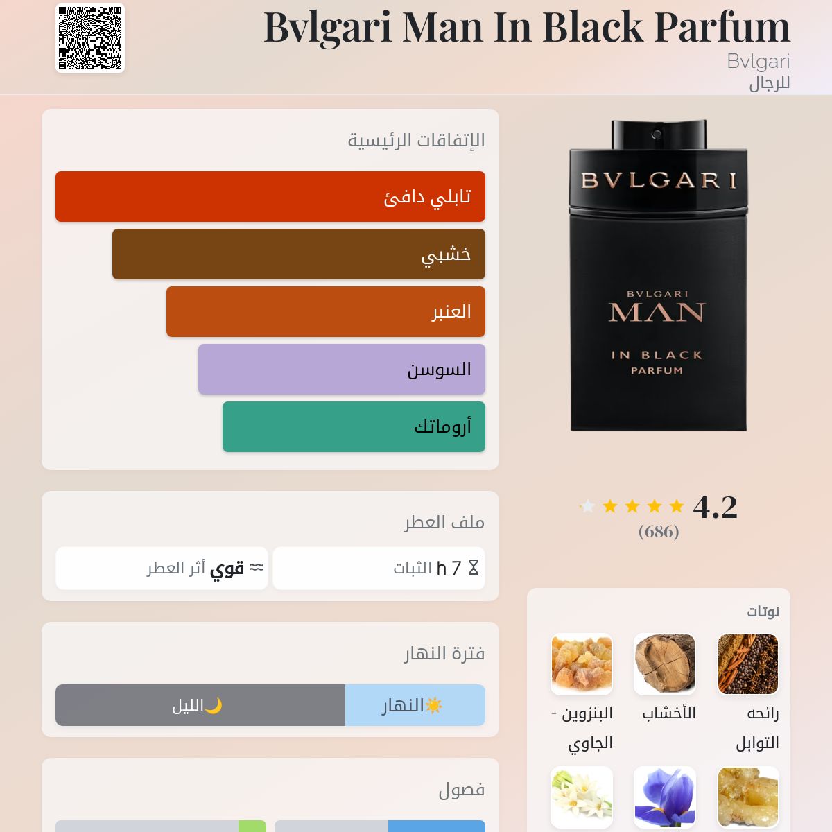 عطر شرقي - خشبي للرجال . Bvlgari Man In Black Parfum صدر عام 2024. Alberto Morillas قام بتوقيع هذا العطر. إفتتاحية العطر التوابل و الإليمي; قلب العطر السوسن و مسك الروم; قاعدة العطر تتكون من الأخشاب الداكنة و البنزوين من سيام.