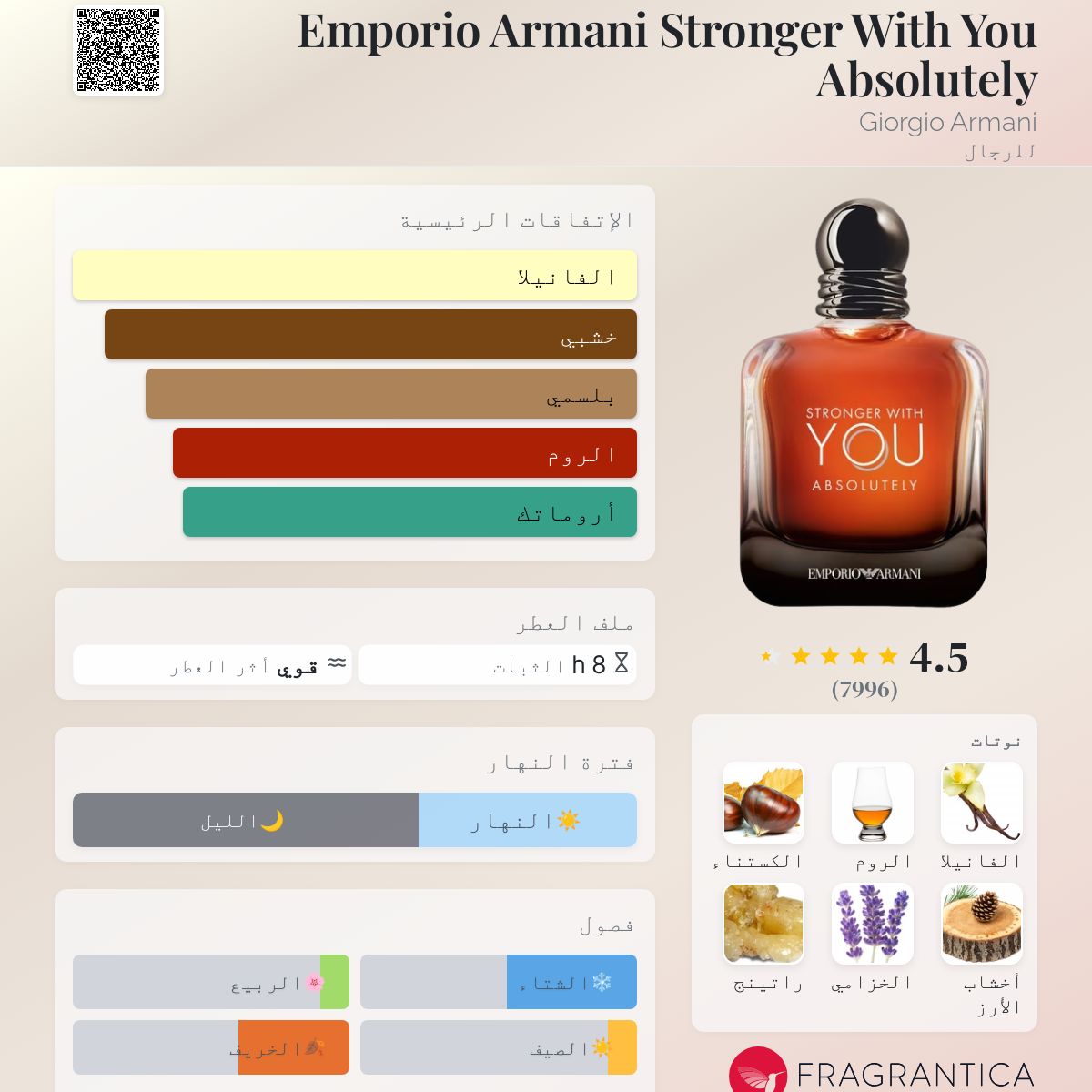 Emporio Armani Stronger With You Absolutely Giorgio Armani عطر شرقي - فوچير للرجال . Emporio Armani Stronger With You Absolutely صدر عام 2021. Cecile Matton قام بتوقيع هذا العطر. إفتتاحية العطر الروم, الإليمي و البرغموت; قلب العطر الخزامي و الدافانا; قاعدة العطر تتكون من فانيليا مدغشقر, الكستناء, خشب الأرز و الباتشولي.