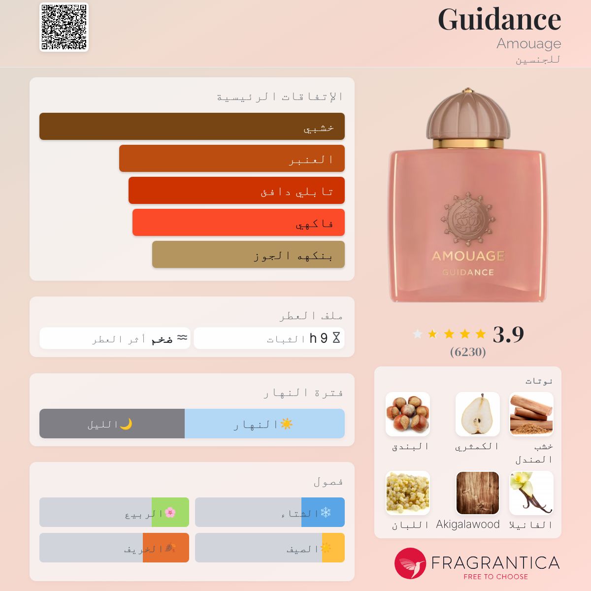 Guidance Amouage عطر زهري - فواكه للجنسين. Guidance صدر عام 2023. Quentin Bisch قام بتوقيع هذا العطر. إفتتاحية العطر الكمثري, البندق و اللبان; قلب العطر أوسمانثوس , الورد, الزعفران و ياسمين سامباك; قاعدة العطر تتكون من خشب الصندل, الفانيليا, أكيغالاوود, الآمبرغريس و اللابدانوم.