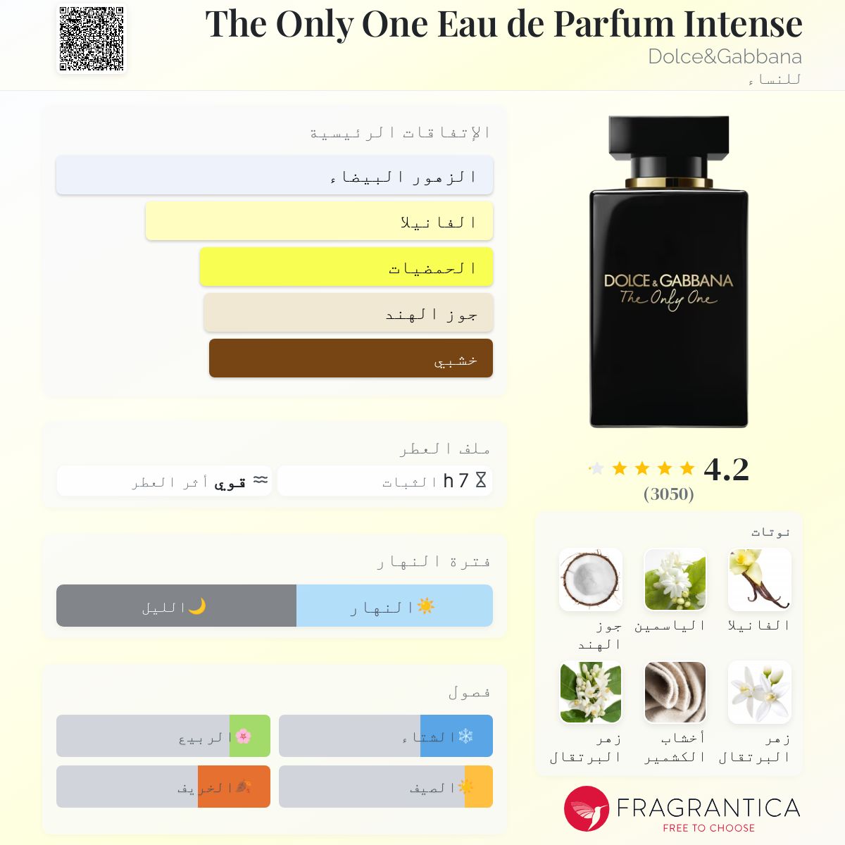 The Only One Eau de Parfum Intense Dolce&Gabbana عطر شرقي - زهري للنساء . The Only One Eau de Parfum Intense صدر عام 2020. Violaine Collas قام بتوقيع هذا العطر. إفتتاحية العطر النيرولي, التفاح الأخضر و الماندرين الإيطالي; قلب العطر الياسمين, جوز الهند و زهر البرتقال; قاعدة العطر تتكون من الفانيليا, أخشاب الكشمير و خشب الأرز.