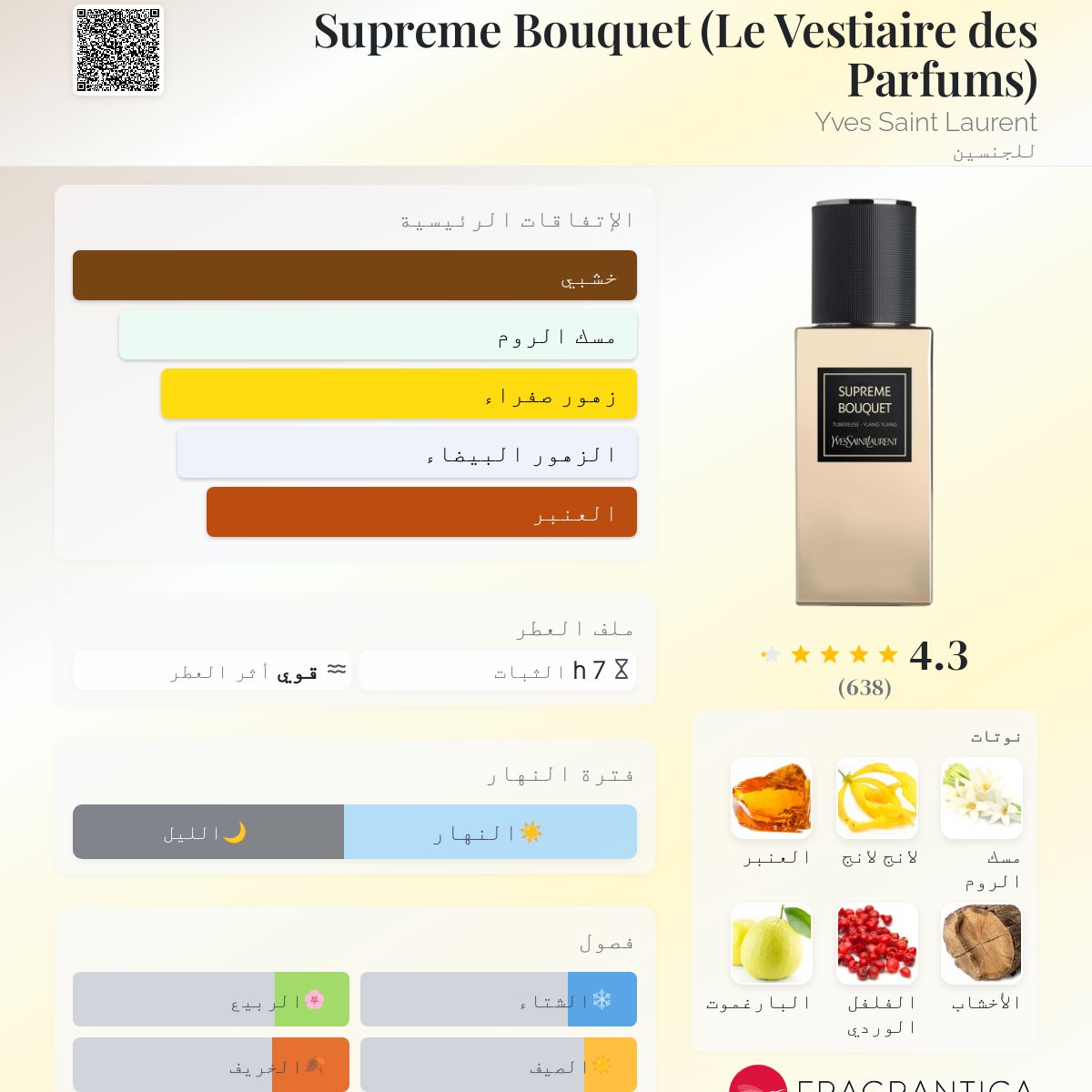 Supreme Bouquet (Le Vestiaire des Parfums) Yves Saint Laurent عطر شرقي - زهري للجنسين. Supreme Bouquet (Le Vestiaire des Parfums) صدر عام 2017. Dominique Ropion قام بتوقيع هذا العطر. إفتتاحية العطر الفلفل الوردي و البرغموت; قلب العطر مسك الروم و الإيلنغ; قاعدة العطر تتكون من العنبر, الأخشاب و الباتشولي.